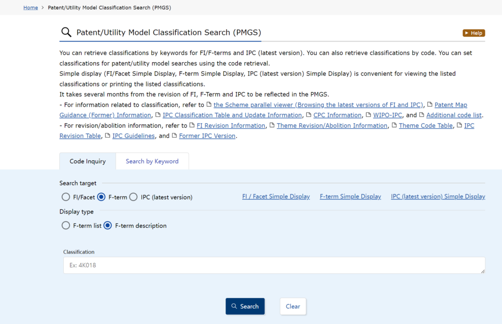 The Japan Patent Office (JPO) provides both Japanese and English versions of the FI and F-term classification tables. To obtain the English version, visit the JPO homepage and find “Patent/Utility Model Classification Search (PMGS)” under the “Patents/Utility Models” section. The URL is https://www.j-platpat.inpit.go.jp/p1101, as shown in Figure 2. Based on my experience, the fastest way to determine the FI/F-term classification number is to first determine the IPC classification number of the technology product, then find the corresponding FI classification number based on the IPC classification number, and finally find the F-term classification number that most closely matches the technical characteristics.